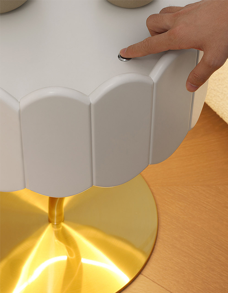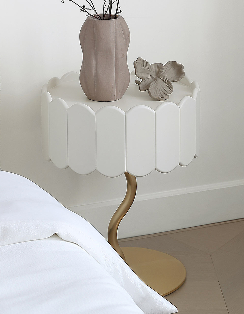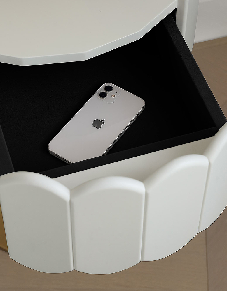 The round bedside table features a sleek white and gold finish, embodying the elegant art deco style. Its compact yet functional design makes it a versatile choice for modern bedrooms, seamlessly blending form and function. The white and gold bedside table and the art deco bedside tables offer ample space for your nighttime essentials.