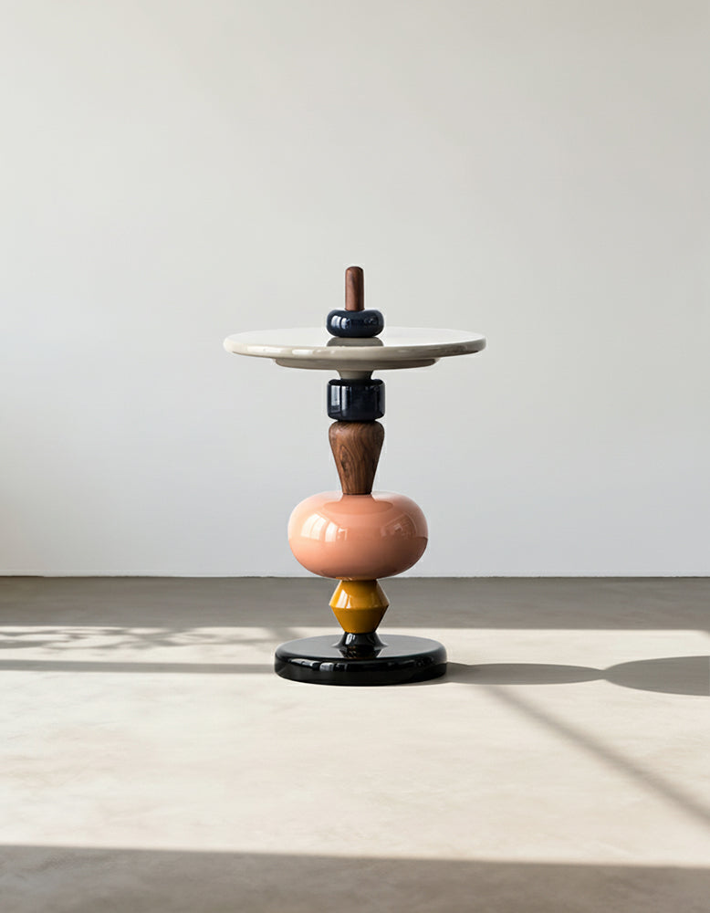 • [Design] A playful and modern round side table with colorful, sculptural details.