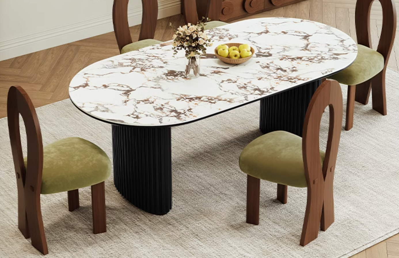 The Escobar Dining Table, a British dining table with a marble effect, is a statement piece that seamlessly blends contemporary design with rustic charm. Crafted from solid wood, its robust construction ensures both durability and longevity, making it a focal point in any dining space. With its large oval dining table shape, the Escobar marble effect dining table provides the perfect backdrop for elegant dinners and casual gatherings alike. |
