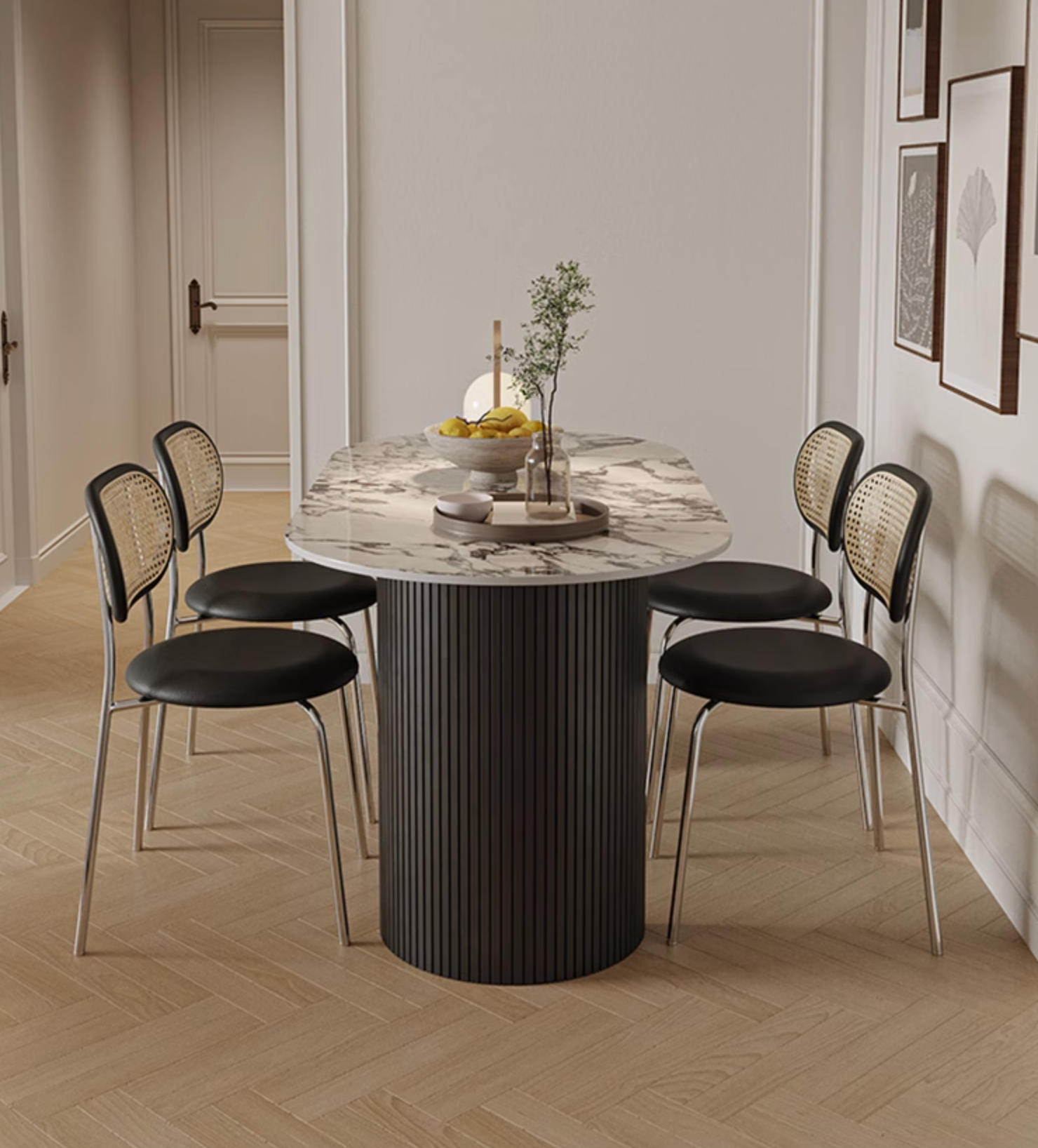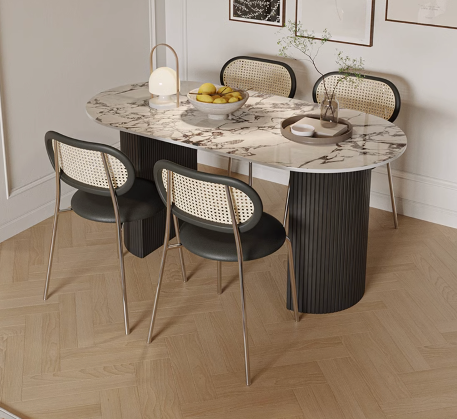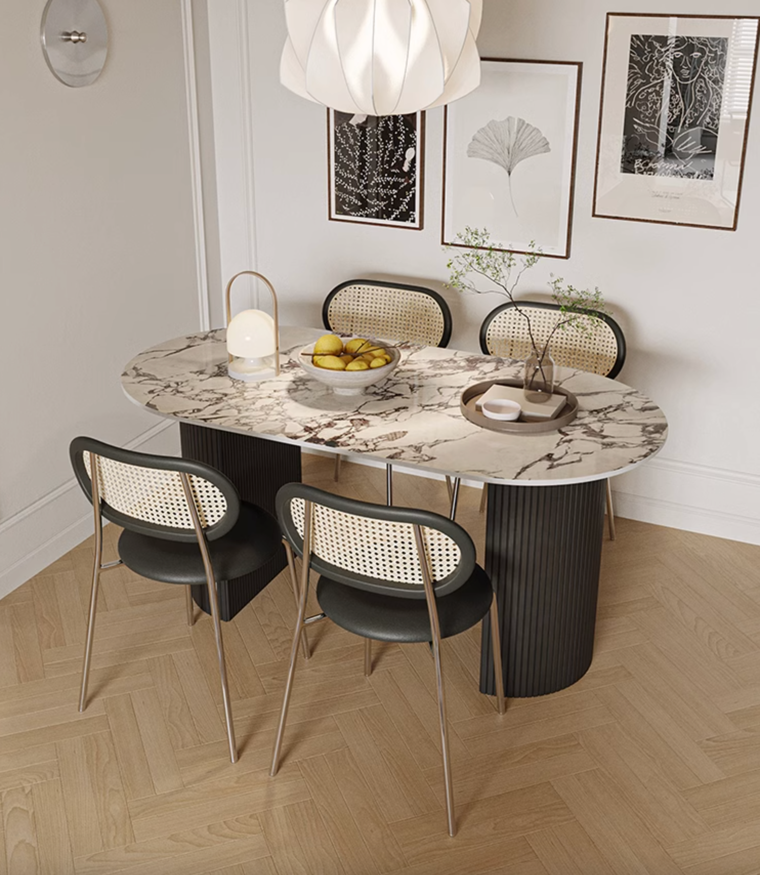 Elevate your dining experience with the Esther Oval Dining Table, a perfect blend of elegance and contemporary design. This marble effect dining table boasts a luxurious surface with a unique pattern, supported by sleek, vertical fluted legs. It's not just a table; it's a statement piece for any modern home. |