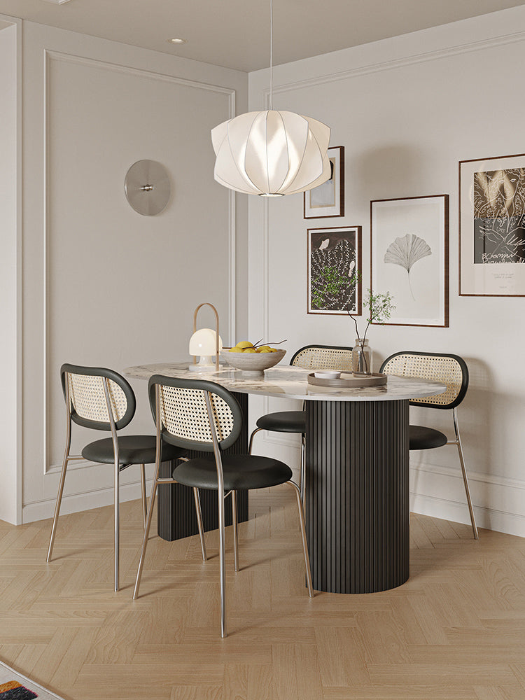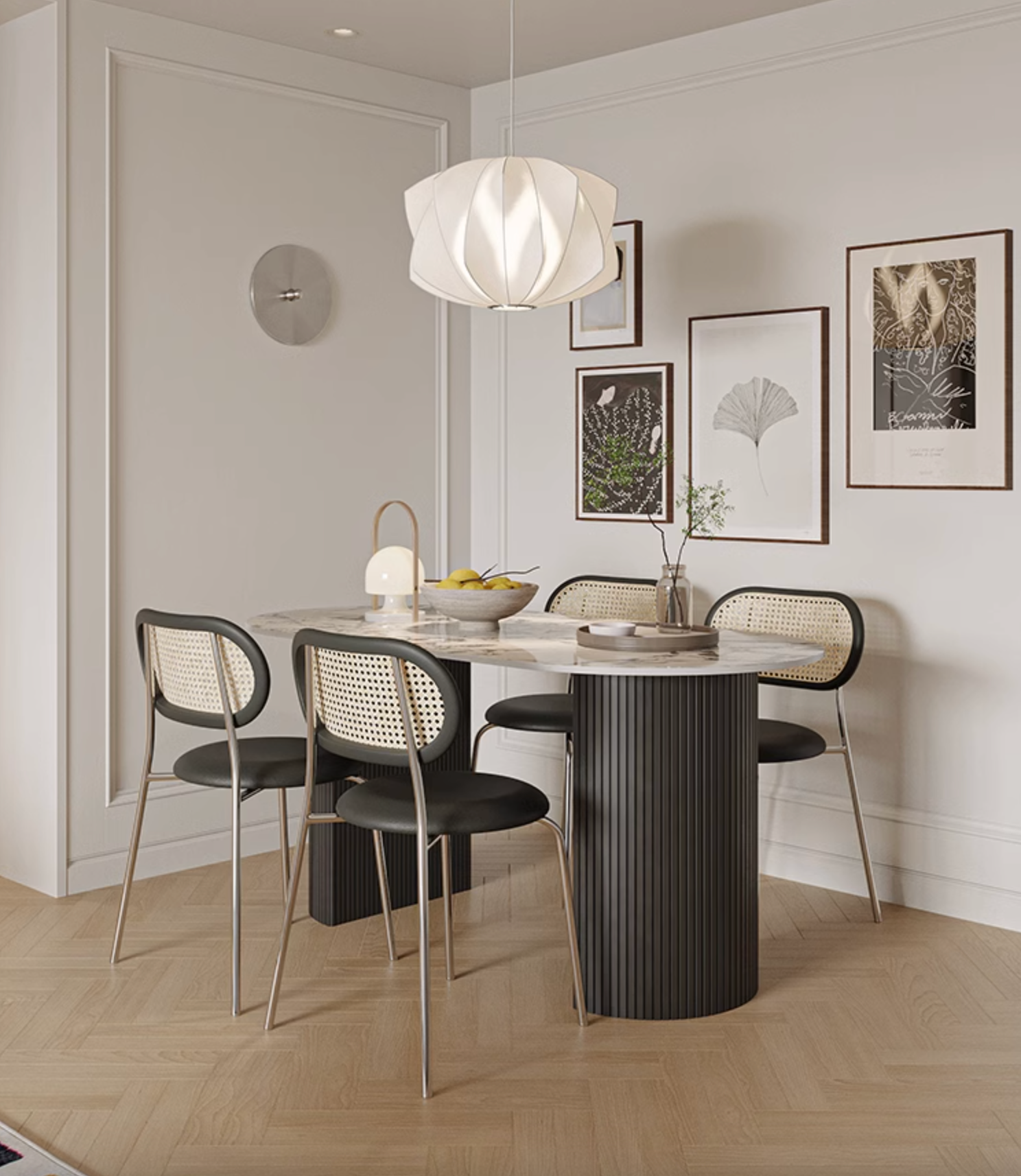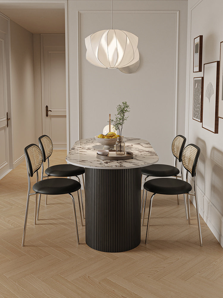Elevate your dining experience with the Esther Oval Dining Table, a perfect blend of elegance and contemporary design. This marble effect dining table boasts a luxurious surface with a unique pattern, supported by sleek, vertical fluted legs. It's not just a table; it's a statement piece for any modern home. |